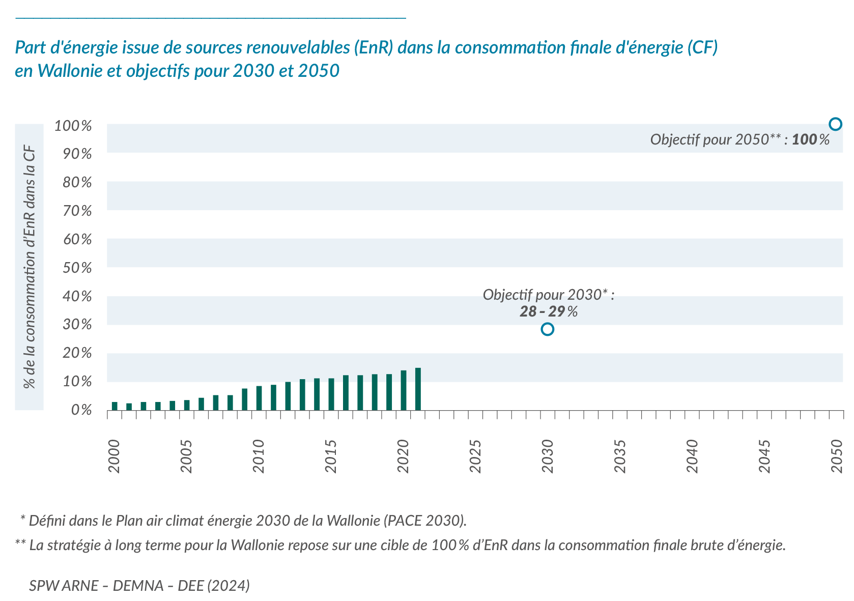 La Wallonie a atteint l'objectif qui lui était assigné pour 2020[5]. À l'horizon 2030, l'objectif est d'atteindre une consommation d’EnR de 31,25 TWh, représentant 28 à 29 % de la consommation finale d'énergie (PACE 2030). À l'horizon 2050, la Stratégie à long terme pour la Wallonie "Vers une Wallonie climatiquement neutre en 2050"[6] repose sur une cible de 100 %.