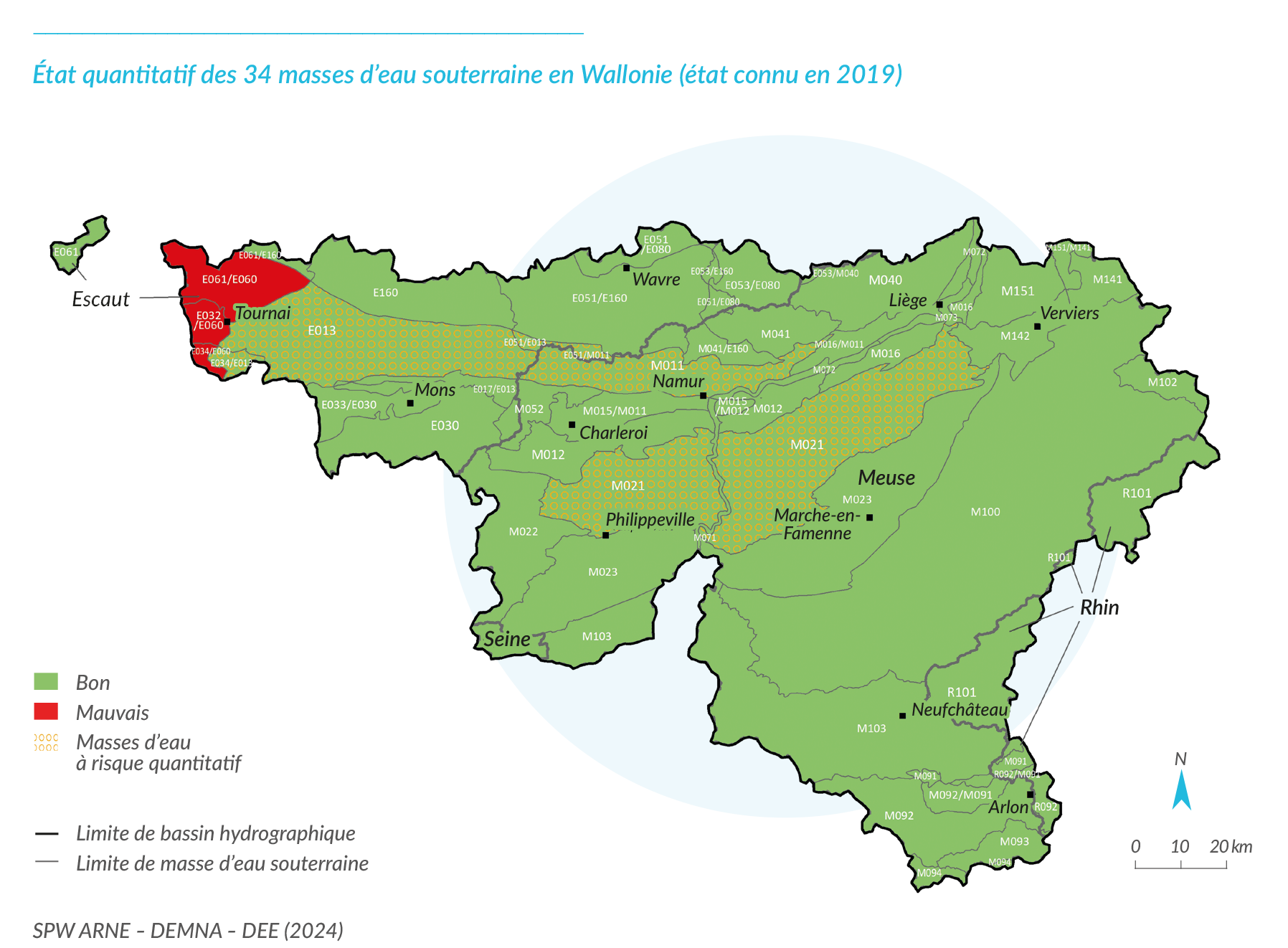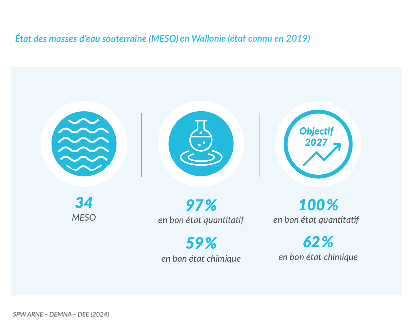 En application de la DCE, l'état des 34 masses d'eau souterraines (MESO) wallonnes est évalué sur base de leur état quantitatif et de leur état chimique.